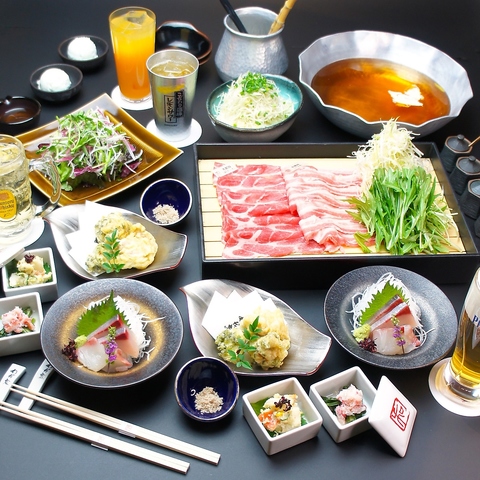 「前菜2種」「セリと大根のシャキシャキサラダ」「国産鴨の自家製つみれ椀」「寒鰤と旬魚のお造り」「土浦蓮根のつくば鶏はさみ焼き」「北海道産真鱈白子の磯辺天」「厳選豚のしゃぶしゃぶ2種食べ比べ」「〆の一品」「デザート」。★新年会コースは、飲み放題キャンペーン★30分延長無料!!