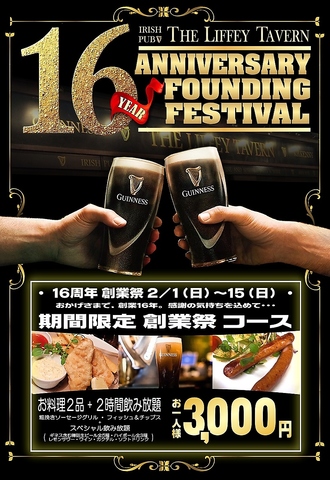 2月1日(日)から!全店にて創業祭コースをご用意!全樽生ビールも飲み放題のSPな飲み放題とお料理2品付♪