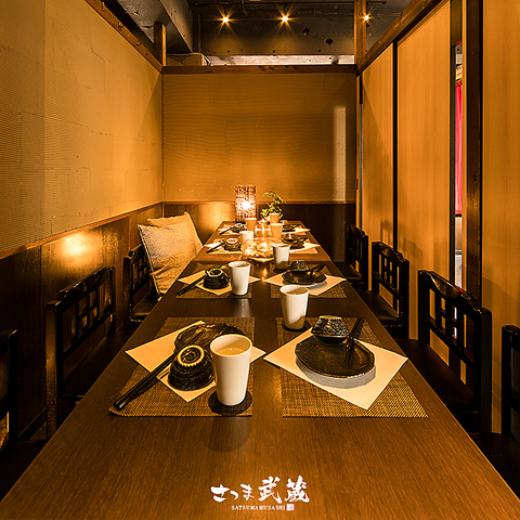 店内に一歩踏み入れると落ち着きある雰囲気の和空間が広がります。そこはまさに“大人の隠れ家”。旬の食材を使った逸品料理と旨い酒をゆっくりとお愉しみいただけます。やわらかな印象の間接照明が、接待や会食、合コンなどにもピッタリの雰囲気を演出します。三田、田町でのご宴会をお考えなら是非、「さつま武蔵 田町店」へお越しください。