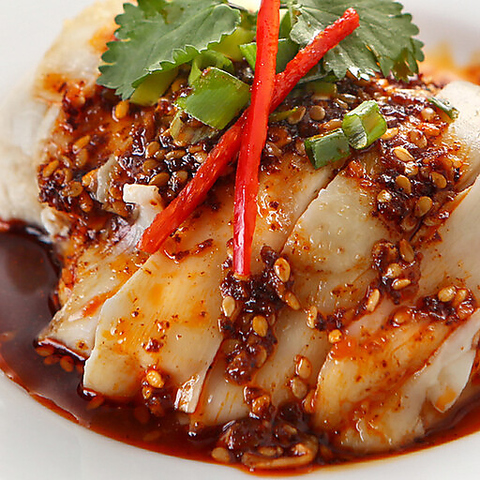 山椒とラー油を効かせた、四川風ソースを加えた絶品の蒸し鶏。