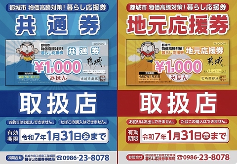 都城市物価高騰支援券両方とも取扱店になりました。是非この機会にお使いください。