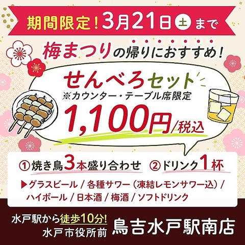 【3/21(土)まで:カウンター・テーブル限定】梅まつりの帰りにおすすめ!せんべろセット1100円