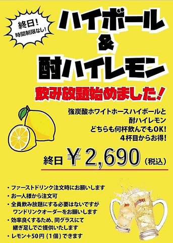 【時間制限なし!】ハイボール&酎ハイレモン飲放
