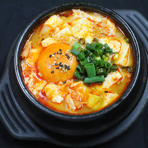 【辛さ★☆☆☆☆】スンドゥブにチェーダチーズを合わせた濃厚な一品です。豆腐の柔らかな食感とチーズのクリーミーな味わいがスープに溶け込み、まろやかでコクのある美味しさが楽しめます。【Spiciness ★★★☆☆】Sundubu with melted cheese for a rich, indulgent twist. The soft tofu and creamy cheese blend perfectly, creating a deeply flavorful dish!