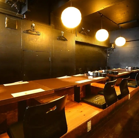 常連様にも人気の店内は、和と洋が心地よく混在する落ち着いた空間です。段差が緩やかで座椅子も完備した掘りごたつ席は、お年寄りやお子様連れのご家族にも安心。足を伸ばしてゆったりとお寛ぎいただけます。さらに、広々としたテーブル席やカップルに最適なカウンター席も完備し、あらゆるシーンにマルチに対応いたします。
