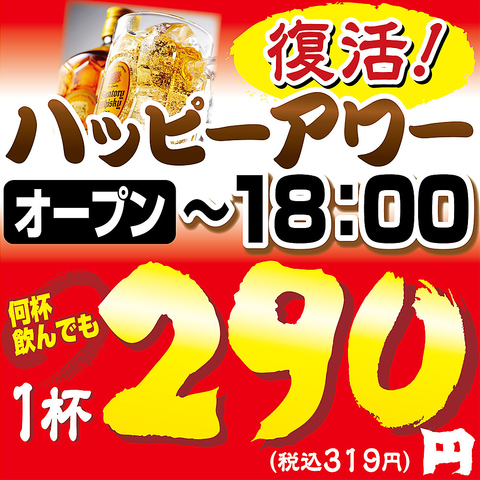 毎日オープンから18時まではハッピーアワー!生ビール、角ハイ、サワー類が290(319)円で!