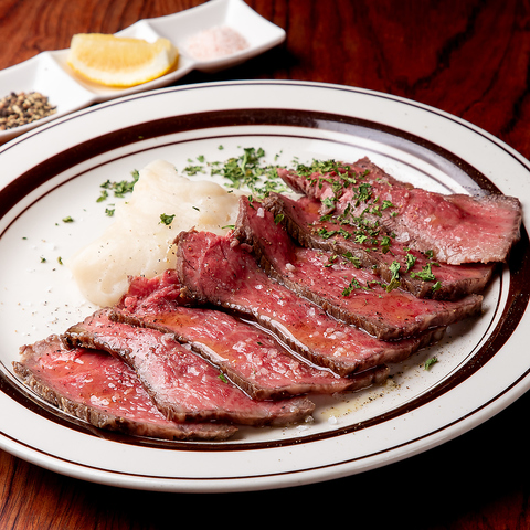 当店自慢の黒毛和牛ローストビーフはご注文が入ってから焼きに入ります。焼き上がりまで約40分、少々お時間をいただきますが、その分美味しいローストビーフをご堪能いただけますよ♪塩胡椒レモンorパセリニンニクバター(¥100)でお召し上がりください♪