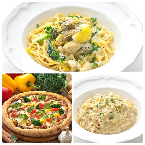 ズワイガニや広島県産牡蠣、ほうれん草など旬の食材を使ったパスタ、ピザをご用意しております。