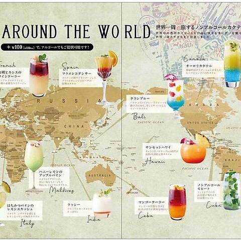 世界の都市やリゾートをイメージした全10種のノンアルコールカクテルをぜひお試しください!色鮮やかで個性的なカクテルは見ているだけでも楽しく、甘口・辛口・苦味などのバリエーションからその日の気分やシーンに合わせて選べます。+110円(税込)でアルコール入りをご提供♪