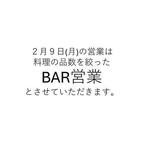 2月9日月曜日の営業は、料理の品数を絞った「BAR営業」とさせていただきます。ご予約の際ご注意ください。