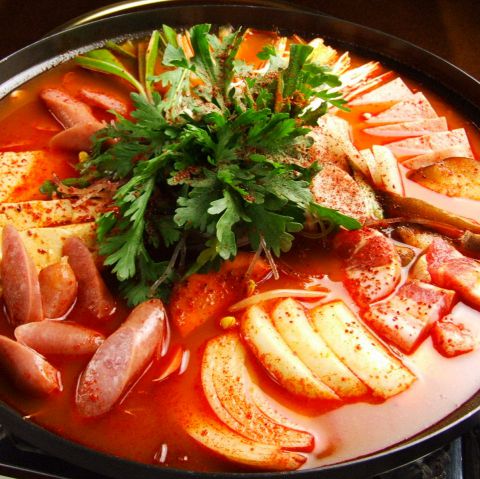 プデチゲは、韓国のチゲの一種★肉、野菜、豆腐などといった一般的なチゲの材料と共に、ソーセージまたはスパムに代表されるランチョンミート、インスタントラーメンといったの食材を辛味のスープで煮込んだ、大衆的鍋料理です♪