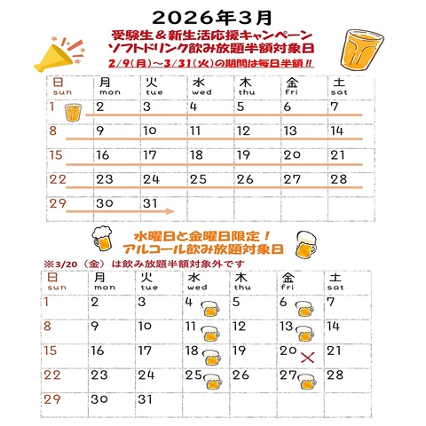 【3月】飲み放題半額の対象日です!ソフトドリンクをお手軽にお楽しみいただけるキャンペーンを3月31日まで実施中!