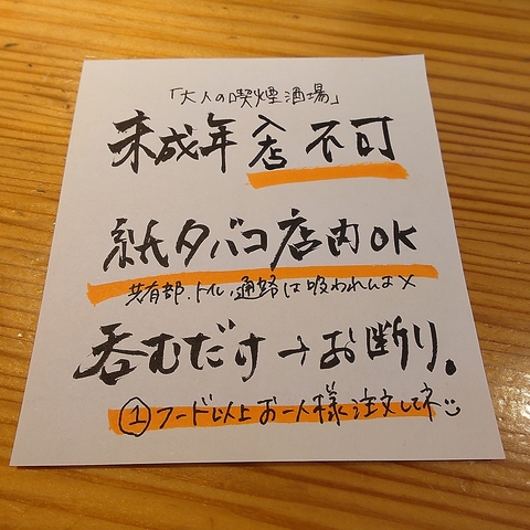【お一人様、1フード(400円以上)&1ドリンクオーダー制】お席は予約時間より2時間制です。「飲食喫煙酒場」と銘して営業中ですのでお食事をされないお客様やカフェ利用には大変不向きなお店です。お子様連れのご入店はお断りしております。予めお連れ様とご確認をお願い致します。