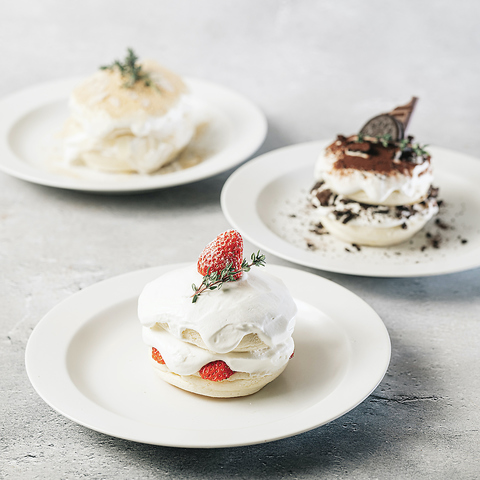 ふわふわしっとり食感のスフレパンケーキにたっぷりのホイップクリームを使ったオリジナルスイーツ
