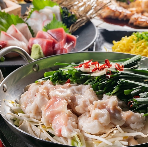 写真は当店イチオシ、季節限定の宴会『こだわりの牛もつ鍋、豪華本鮪を使った刺し盛り4点コース』!ぷりぷりの牛もつがたっぷり入った鍋が自慢の宴会コース!新鮮な本鮪を使用した豪華刺し盛り4点も付いてくる大満足な内容!備長炭でじっくり焼き上げた焼き鳥も絶品!生ビールやハイボールなど120種類以上の飲み放題付!