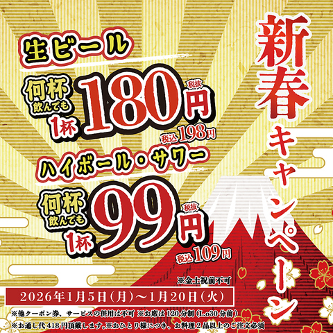 ★☆★ 2026年 新春祝い酒 ★☆★【1月5日~20日 限定開催】新年の乾杯は、思いっきりおトクに!期間中は何杯飲んでもこの価格!生ビール1杯 180円(税込198円) / サワー・ハイボール1杯 99円(税込108円)!新春だけの大感謝企画!仕事始めの一杯も、仲間との飲み会も、心ゆくまでお楽しみください。