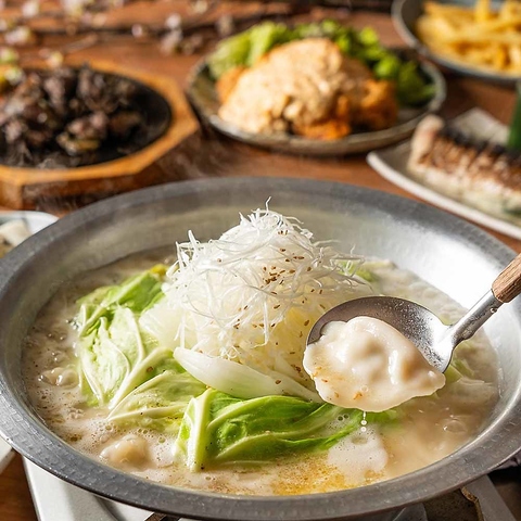 モッチリ、シャキシャキ、コリコリ! 食感の変化が楽しい♪人気鍋「炊き餃子」のコース限定版! 看板メニュー「地鶏の炭火焼」「若鶏チキン南蛮」も付いてコスパも◎