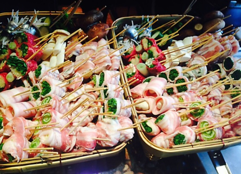 名物 レタス巻き串 (塩/ソース/チーズ)・アボカドチーズ・トマト巻き・アスパラ巻き・ブロッコリーチーズ巻き・マルチョウゴボウ・しめじチェダー巻き・博多万ネギ巻きなどこだわりの厳選素材を使用した野菜巻き串を種類豊富にご用意しております。見た目も鮮やかで楽しい逸品♪ぜひお試しください♪