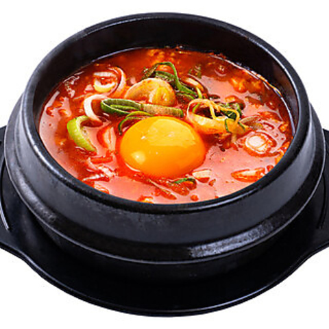 やわらかい豆腐に辛味の効いたスープです。スンドゥブチゲとして人気深いい~オモニの味。とんちゃん一押し!