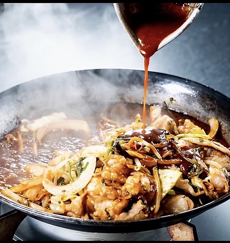 自慢の国産モツを専用の鉄板で焼き上げる名物はじめ焼き!ピリ辛なのに旨味がありさっぱりした味わい♪