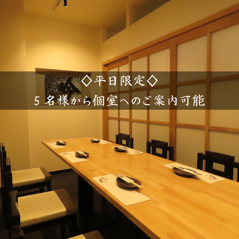 平日に限り、通常は大人数様向けの**「完全個室」を5名様から広々と**ご利用いただけます。