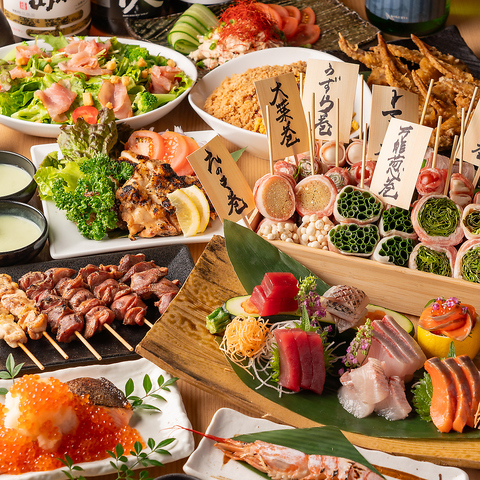 熟練の火入れで仕上げる自慢の焼き鳥や、こだわりの鶏料理、海鮮ちらし寿司など質にも量にも自信あり!宴会コースなら余すことなくお楽しみいただけます◎すべて、2時間飲み放題付き