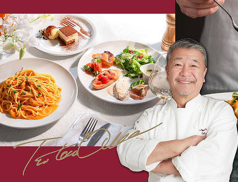 〈前菜〉トマトのブルスケッタ、低温料理チキン トンナートソース、サーモンのカルパッチョ ディルのドレッシング、フリッタータ セサミ香るオーロラソース、ブロッコリーと生ハム、サラダ ジュエノベーゼシーザードレッシング 〈1品〉 落合シェフ ウニのパスタ〈デザート〉ティラミスのデザート