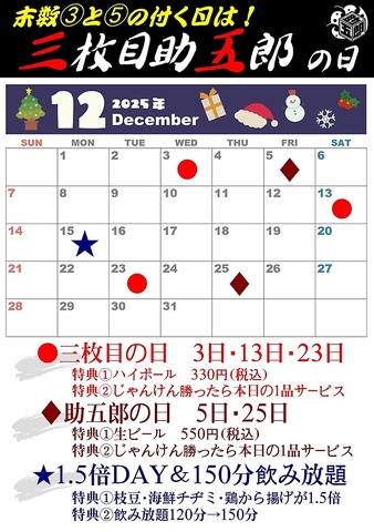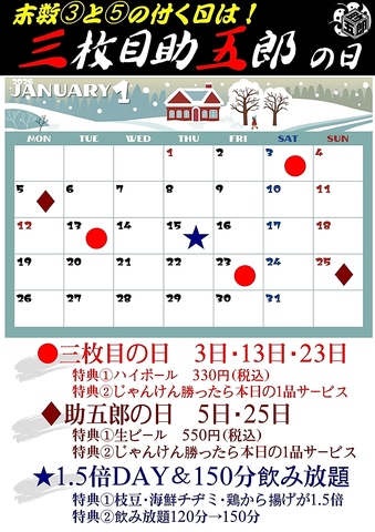 毎月、3と5のつく日は助五郎の日!日によってさまざまな特典をご準備しております!