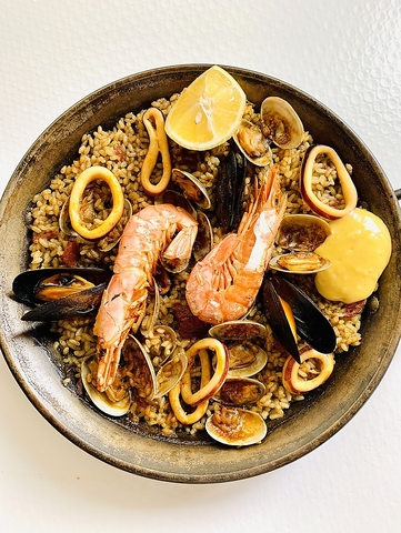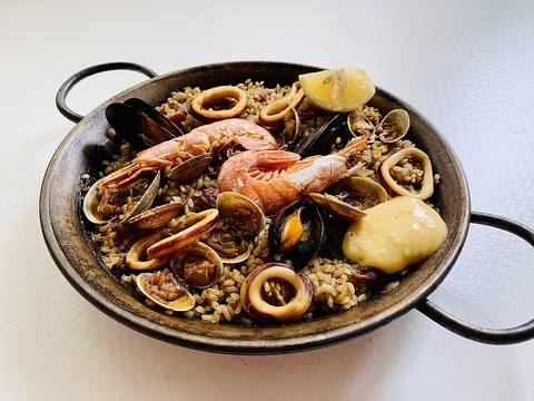 エビ・アサリ・イカなど、旨味たっぷりの魚介を贅沢に使用した、当店自慢のシーフードパエリア。魚介の出汁が染み込んだ福島県産のお米は、ひと口ごとに海の香りが広がります。
