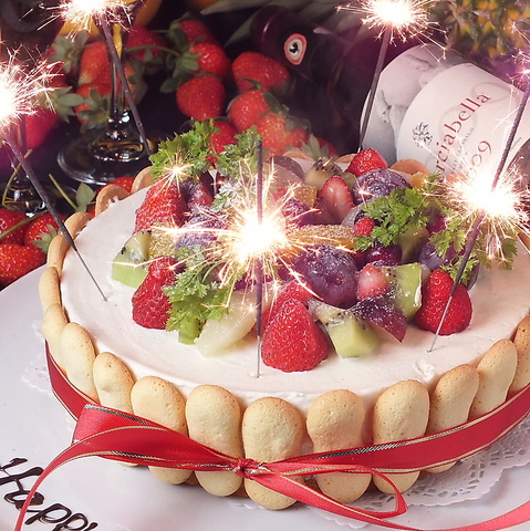 メッセージ入りホールケーキの作成をいたします。お誕生日、歓送迎会、何でもOK!コースのデザートなら【無料】でホールケーキへの変更ができます。