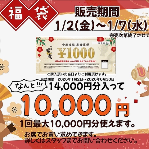 大好評の暖龍福袋が1/2~1/7まで限定販売!とってもお得なお食事券です★完売次第終了!お早めに!