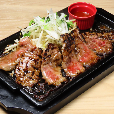 和牛の上質な肉を直火で炙り、熱々の鉄板で作り上げる。秘伝の焼肉ダレが香ばしい人気メニュー!