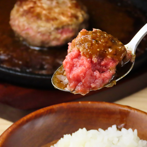 当店の和牛100%のハンバーグは、トロトロの食感が魅力で旨味がたっぷり!特製スパイシーソースとの相性◎