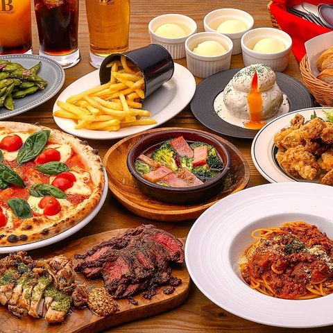 人気No.1!! 2名様~貸切まで対応! 人気のバルゲリータピザ、ローストビーフ、A5黒毛和牛グリル、ボロネーゼパスタなどを含む全10品と飲み放題が付いたお得なコース。