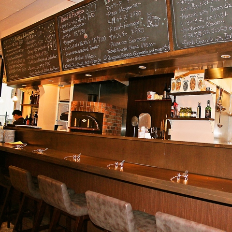 テーブル席、オープンキッチンの前のカウンターと本場イタリアンバルをイメージした店内☆