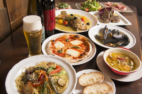 鎌倉野菜などを使った前菜4種盛り合わせからムール貝の白ワイン蒸、マルゲリータ、パスタ、 お肉 料理orお魚料理と贅沢なラインナップ♪お好みでムール貝やアクアパッツァのスープでリゾットも無料でお作りします!