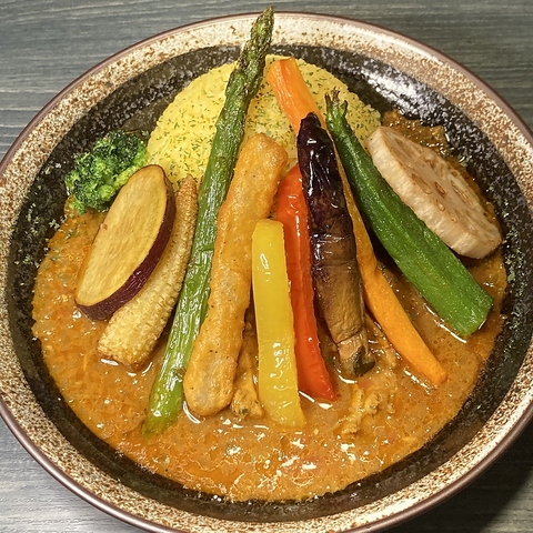 このカレーに一番お勧めのトッピング「素揚げ野菜」をのせました!野菜の甘みと一緒にお召し上がりください!