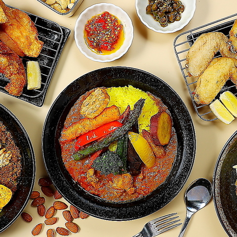 六種類も無水スパイスカレーを一皿に!贅沢な至極の一品となっております!それぞれの味を堪能してネ!