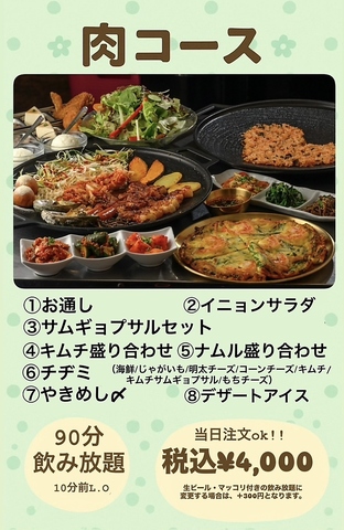 肉肉!!美味しいお肉を食べて元気になりましょう!!飲み放題付のお肉コース料理が4000円(税込)!女子会にも人気なチーズダッカルビコースもオススメです!ぜひ、当店にてお愉しみください♪