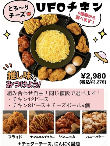 チキン12ピースorチキン8ピース+チーズボール4個から選べる◎組み合わせ自由で同じ値段でお選びいただけます!チキンはフライド・ヤンニョムチェダー・ヤンニョムチキン・ハニーバターチキン・チェダーチーズ・にんにく醤油の6種類から選べるので、是非推しの味を見つけてください♪