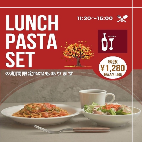 平日はランチ営業を11:30~15:00まで実施中です♪当店では、ランチセットメニューをご用意しております。セット内容は、パスタ・サラダ・ドリンクのセットです。期間限定パスタメニューもご用意しており、お客様がいつご来店しても飽きないメニュー展開を心掛けております。