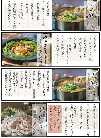 もつ鍋コースか焼きホルモンコース選べます。その他プレミアムコースや特別なあぐー豚しゃぶしゃぶコースも