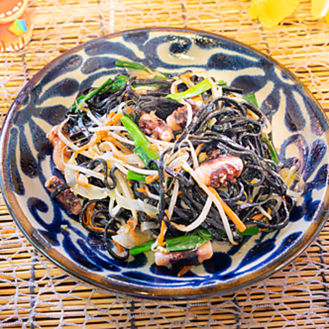 イカスミを練り込んだ麺が特徴の郷土料理!麺には沖縄そばを使用し、イカスミの風味と独特な黒い色合いが楽しめます!