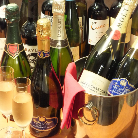 ワインの種類も豊富に取り揃え♪お誕生日などのお祝いの際には店長からシャンパンプレゼントもあり★