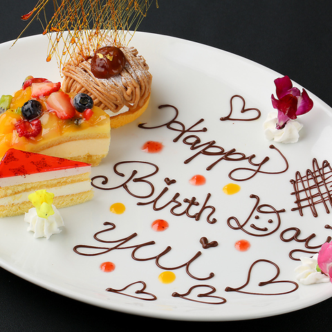 お誕生日・ご結婚祝い・還暦祝いなどの記念日にオリジナルメッセージの入ったアニバーサリープレートをご用意致します!(要予約/2名~)ご予約時にプレートにお書き添えするメッセージをご記入ください。