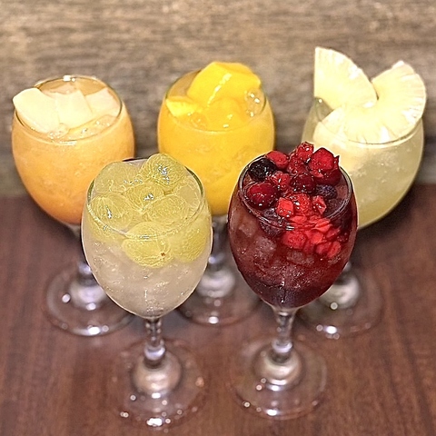 | 名物!フルーツたっぷりサングリア 5種【ノンアルコール出来ます】 | サングリアパイン(爽やかな酸味で南国気分)/サングリアピーチ(すっきりな甘さ女性に大人気)/サングリアマンゴー(酸味と果実感がマッチ)/サングリア白ぶどう(王道サングリア!)/サングリアベリー(赤ワインとベリーの相性抜群!) |