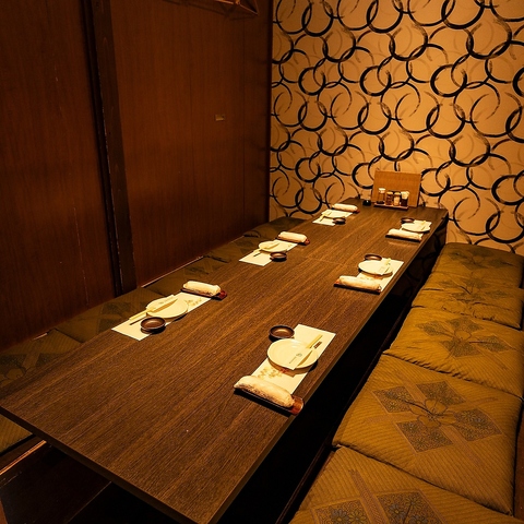 明るさを抑えた照明、シックな和の設えは、京橋の中心地にいることを忘れさせてしまうほど落ち着いた空間。スタッフも交えて、ワイワイ楽しみたい時は、カーテンを上げて、オープンなお席としてご利用いただく事もこちらのお席の人気のポイントです。掘りごたつ席ですので、足を伸ばしてゆったりおくつろぎください。