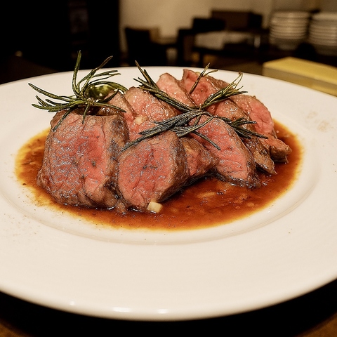 コースでも人気の一品を単品でご提供。表面を香ばしくグリルし、低温でじっくり火入れすることで、しっとりジューシーな仕上がりに。赤ワインと肉の旨味を活かした自家製ソースが絶妙にマッチ。しっかり食べ応えがあり、お酒との相性も抜群です。一度食べたらリピート間違いなしの逸品です。