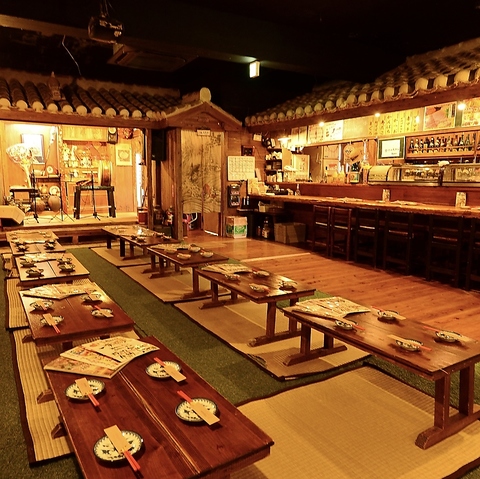 落ち着いた広い空間で、生演奏の民謡ライブが楽しめます。お酒も泡盛やハブ酒など取り揃えておりますので、2階の「昭和村」からの二次会利用にも便利です♪団体さんも大歓迎!お店からお店の移動も楽チンなので、ご宴会の際は幹事さんも喜ばれますね(^0^)