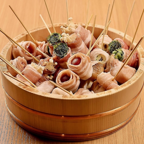 当店イチオシメニュー!!おでん出汁にたっぷり染み込んだ豚バラ野菜巻きを、さっぱりポン酢でお召し上がりください。